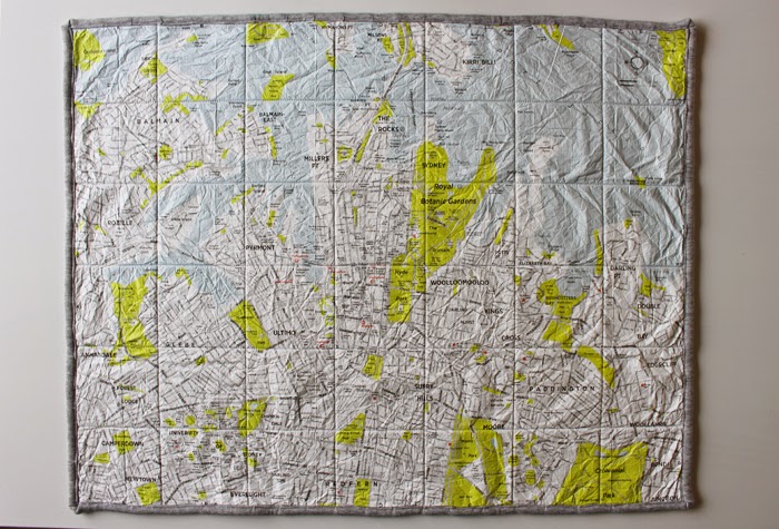 I printed the jumpsuit and mint cloth with templates I cut out of freezer paper and the Sydney changing mat is a crumpled city map I quilted together with thick grey tracksuit fabric. The white jumpsuit is a nod to the fact that Mart's brother has a craft beer wholesale company.